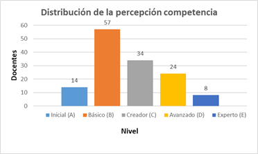 Los resultados de la encuesta permitieron determinar el nivel de competencia digital percibido por los docentes, mostrando una distribución normal. La mayoría de los participantes se agrupan en las categorías intermedias: básico (57 %) y creador (34 %). En los extremos, se ubican las categorías: inicial (14 %) y experto (8 %).