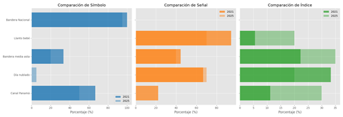 Los resultados muestran que la bandera nacional fue reconocida como símbolo por la mayoría, mientras que el llanto de un bebé fue identificado como señal. La bandera a media asta fue interpretada como símbolo, señal e índice. El día nublado se percibió como señal y el Canal de Panamá como símbolo e índice.